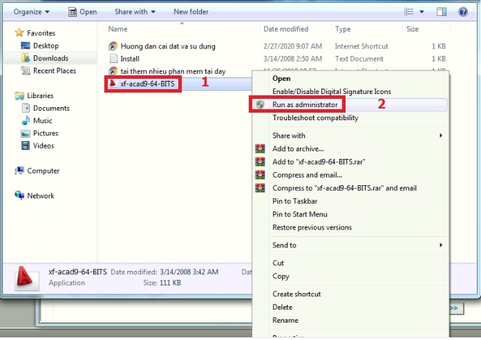 Quay lại folder đã giải nén tìm đến Folder Active và tìm file “xf-acad9-64-BITS.exe” chạy file bằng quyền Administrator.