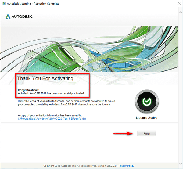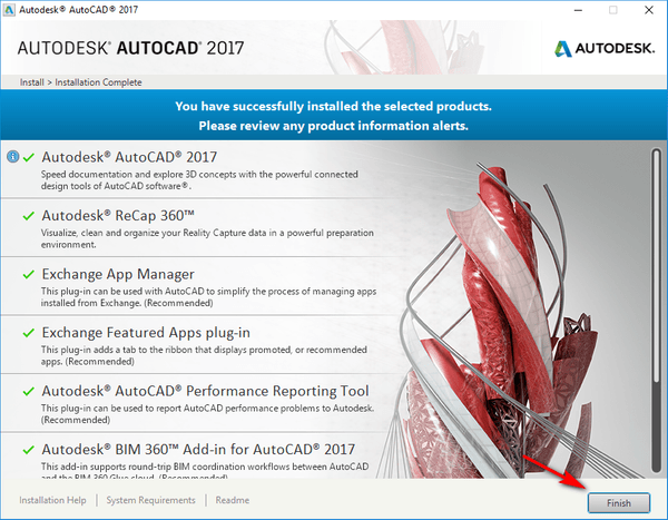 Bước 5: Sau khi quá trình thành công sẽ xuất hiện hình như bên dưới. Lúc này bạn chọn ‘Finish’ và sử dụng Autocad 2017 thôi.