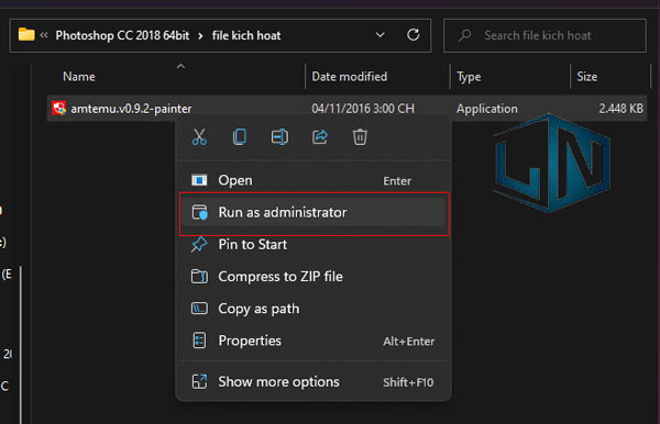 Bước 2: Click chuột phải vào file có tên amtemu, chọn Run as administrator.